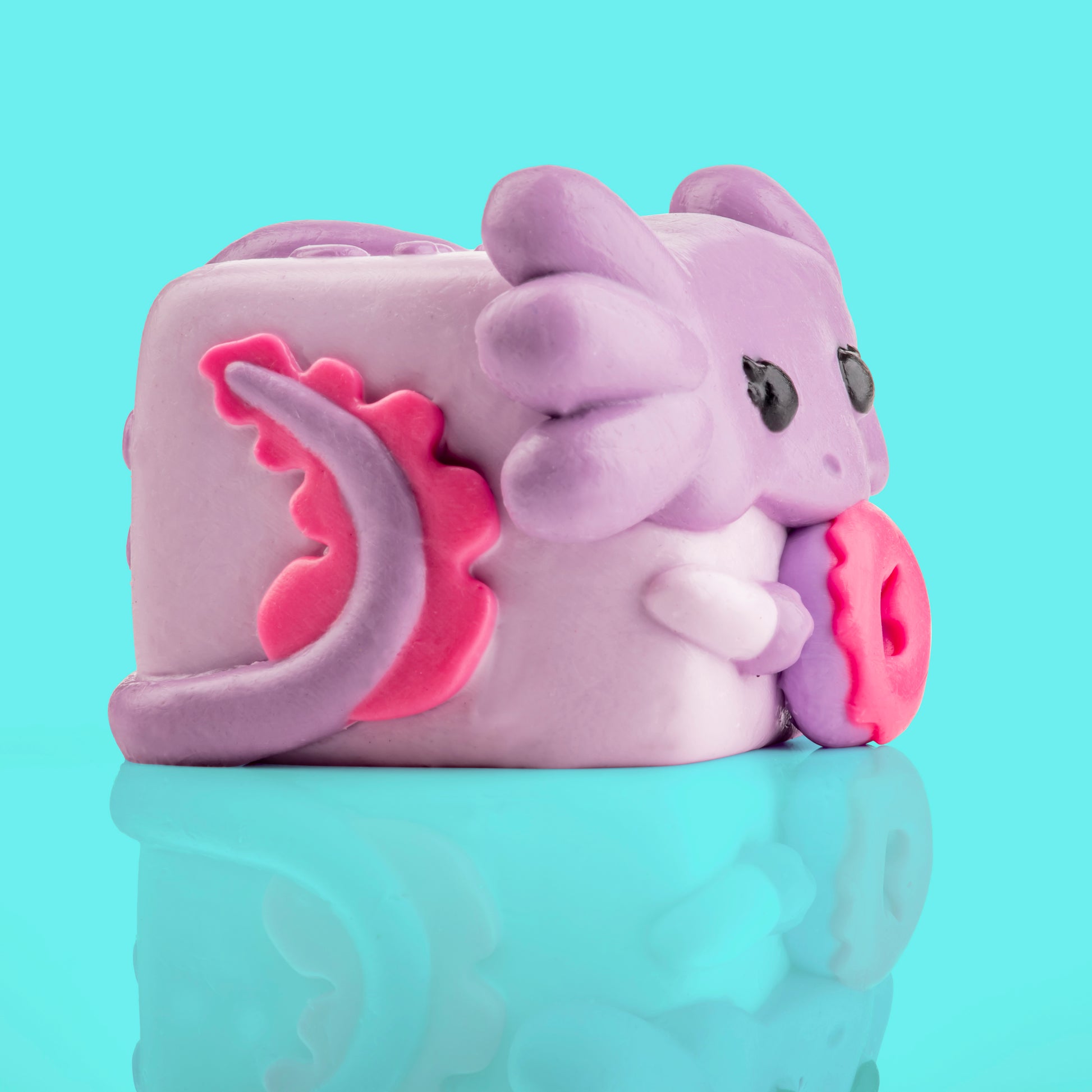 Mochi is a magical Axolotl Mushy who loves swimming in the shimmering waters of the Enchanted Lake and going on adventures. Her skin glows with shifting shades of purple in the sunlight, making her one of the most dazzling creatures in the water. When she’s not gliding gracefully through the lake, Mochi loves exploring the land in search of sweet treats — her favorite stop is the cozy café Foxy’s Den, where she always grabs donuts and mochi (the inspiration behind her sweet name)!